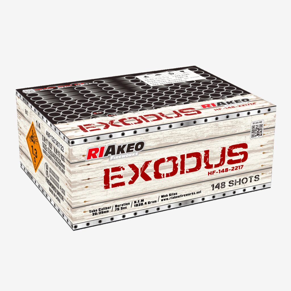 nDie Exodus von Riakeo ein kompaktes Verbundfeuerwerknn(148 Schuss geschossen im Kaliber 20/25mm als X Fächer und einer NEM von knapp 1,9kg)n n n Bukett-Effekte:n n nMit bunten Kometen und darauf folgenden diversen Effekten in schneller Schussfolge bis hin zum Goldfinale als Fächer mit Wirbelaufstieg.
