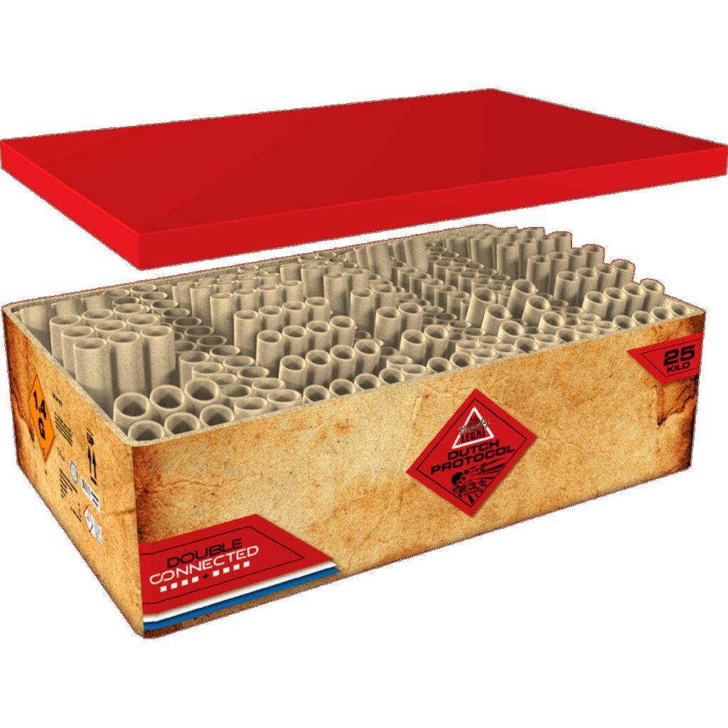 nDeze dubbele compound is gevuld met Nederlands glorie. De kleuren rood, wit, blauw, oranje en goud voeren de boventoon. Deze 25 kg bak bevat alle schietrichtingen en jij bent hiermee zeker de baas van de buurt!